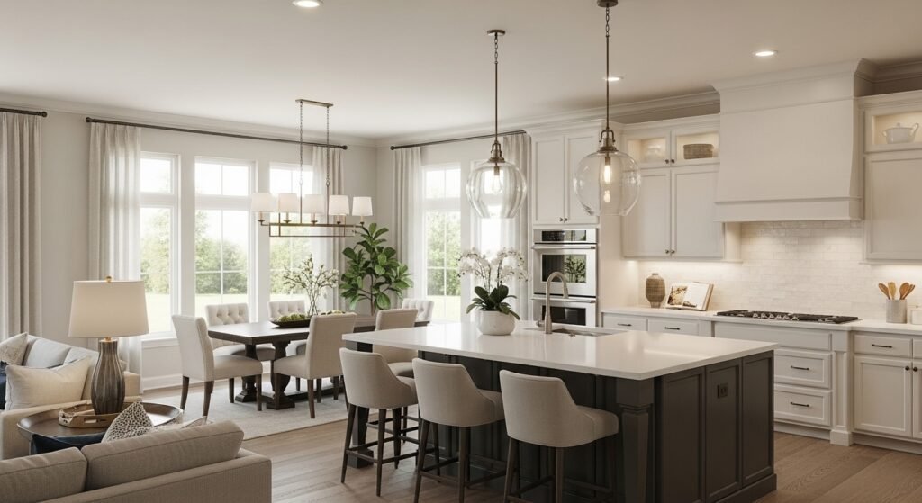 Lighting does quiet but important work in open layouts. Task lighting over the prep area, ambient light above the dining table, and softer accents in transition zones guide movement and make the space feel complete.